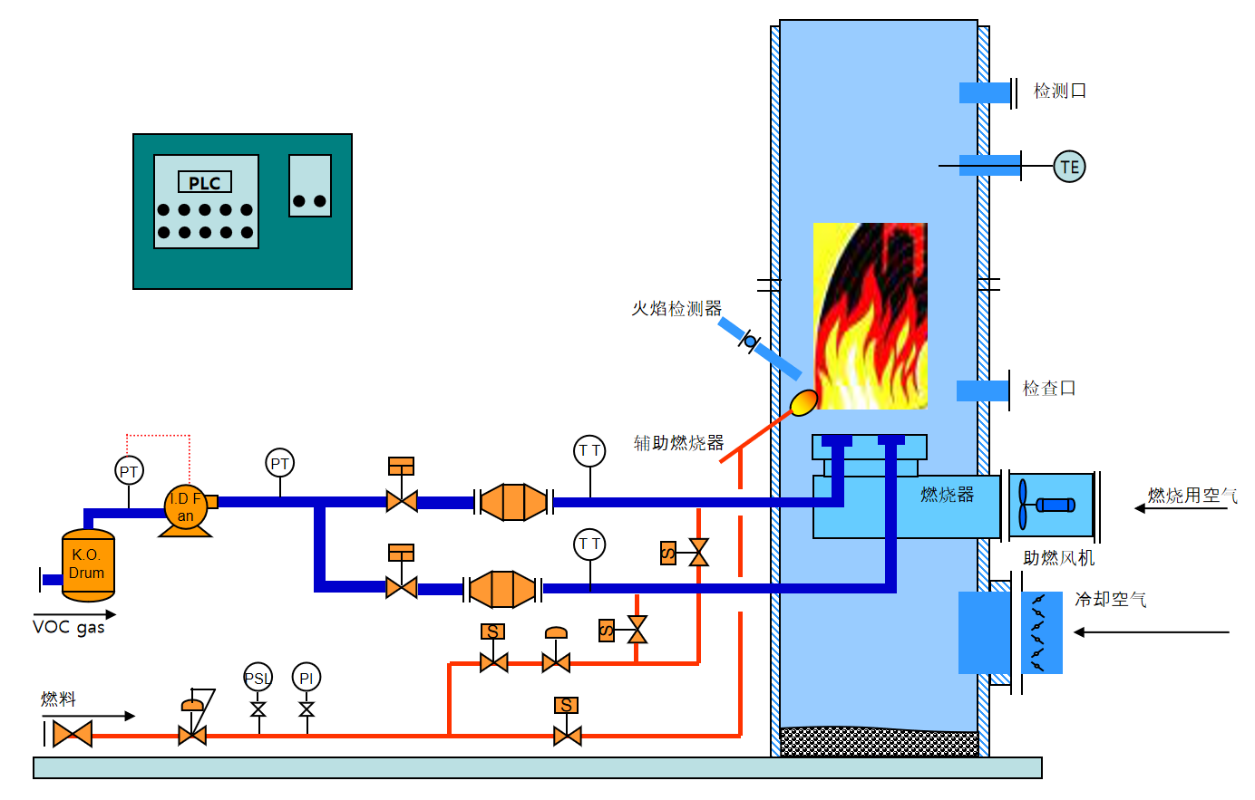 VCU設備是把產生的VOC氣體引入到燃燒煙囪內在800~1000℃下完全燃燒之后,分解為無害、無臭的清潔氣體排放到大氣中的環境治理設備。